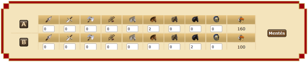 Így néz ki egy farmkezelő sablon beállítás. Amennyiben bárdosokat is küldünk utolsó zárásként átírjuk az egyik sablont és kivesszük a lovasokat. Ez érvényes a védő falunál is. 25-25 gyalogost küldhetünk onnan is. A végén állítsuk vissza lovasokra, mert elfelejtjük és az első farmolásnál másnap meglepetés lesz.