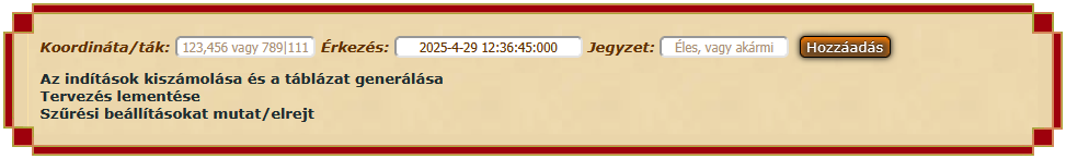 Az indítások kiszámolása a komplett listára érvényes és minden hozzáadott koordinátánál igényel legalább egy hozzáadott parancsot különben nem tervez, de ezt jelzi is.