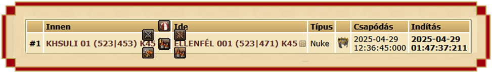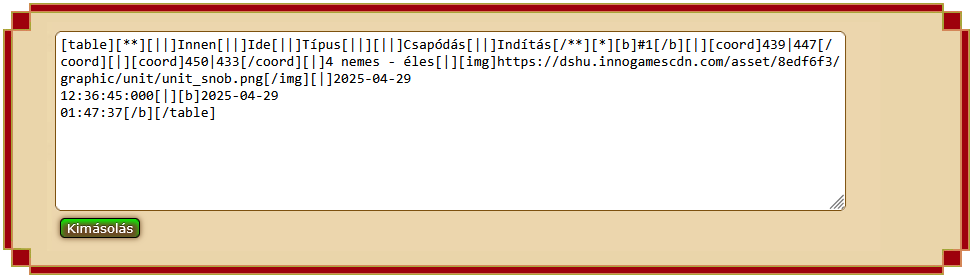 [*][b]#1[/b][|][coord]DPS 001 (523|453) K45[/coord][|][coord]523|489[/coord][|]Erősítés[|][img]https://dshu.innogamescdn.com/asset/8edf6f3/graphic/unit/unit_sword.png[/img][|]2025-07-09